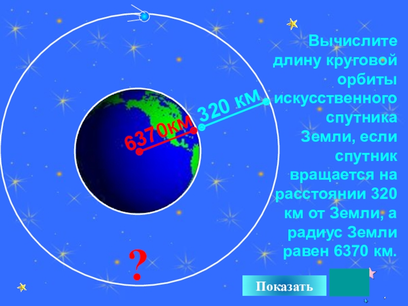 Слайд 25Вычислите длину круговой орбиты искусственного спутника Земли, если спутник вращается на