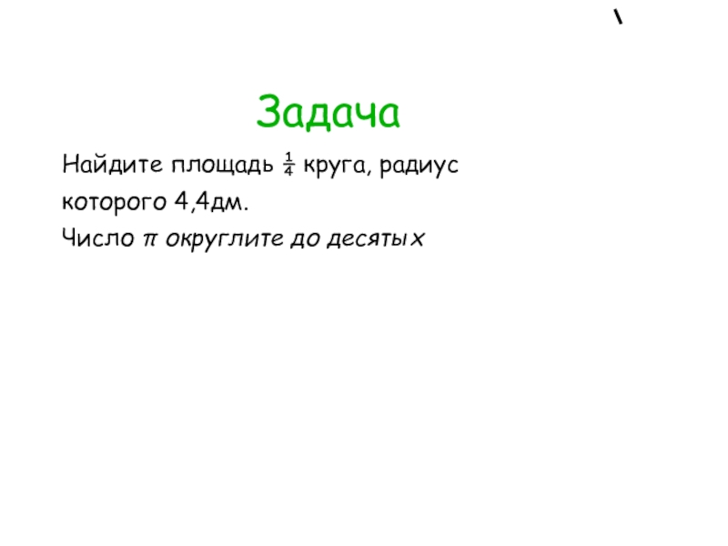 Задача Найдите площадь ¼ круга, радиускоторого 4,4дм.Число π округлите до десятых