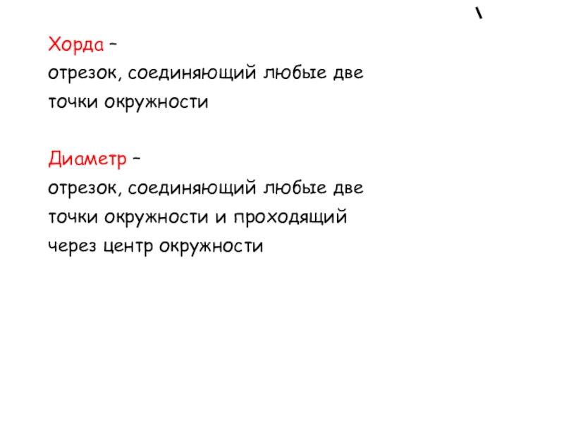 Хорда –отрезок, соединяющий любые дветочки окружностиДиаметр –отрезок, соединяющий любые дветочки окружности и проходящийчерез центр окружности