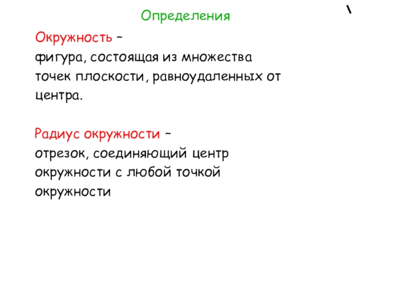 Определения Окружность – фигура, состоящая из множестваточек плоскости, равноудаленных отцентра.Радиус окружности – отрезок, соединяющий центрокружности с любой