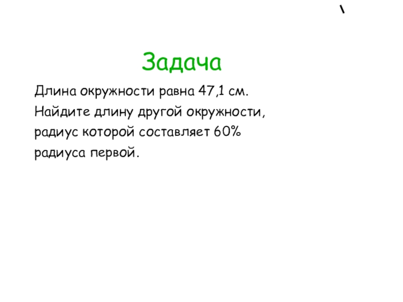 Задача Длина окружности равна 47,1 см.Найдите длину другой окружности,радиус которой составляет 60%радиуса первой.