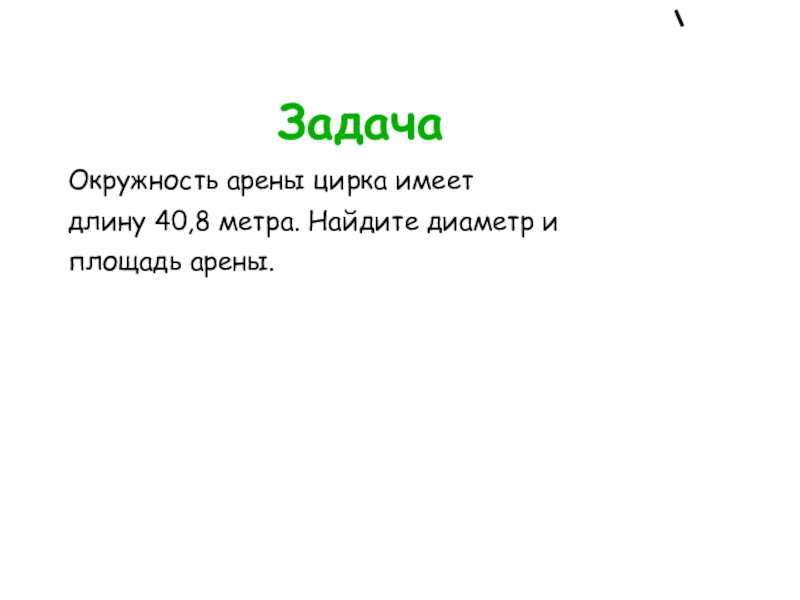 ЗадачаОкружность арены цирка имеетдлину 40,8 метра. Найдите диаметр иплощадь арены.