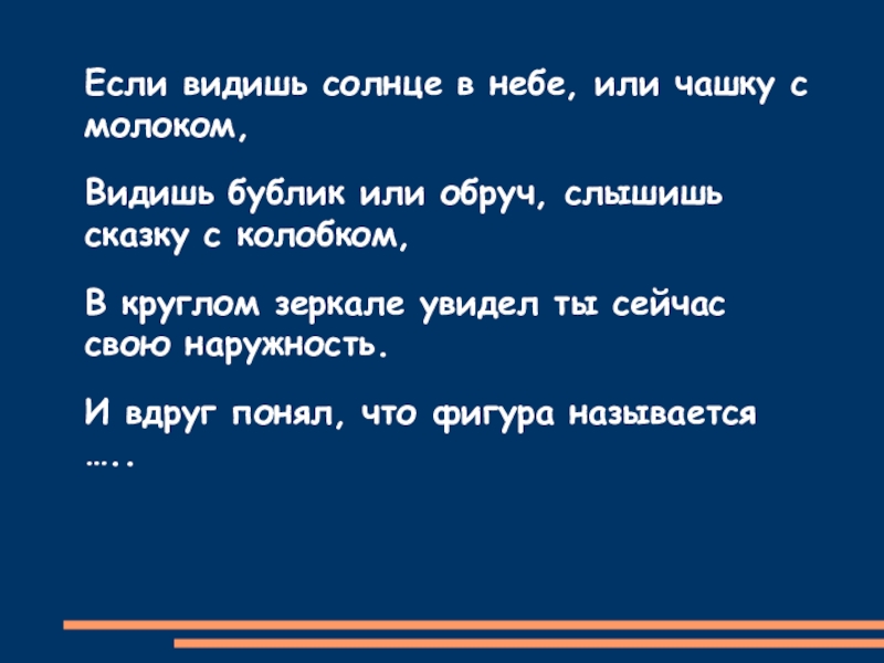 Если видишь солнце в небе, или чашку с молоком,Видишь бублик или обруч, слышишь сказку с колобком,В круглом зеркале увидел ты сейчас свою наружность.И вдруг понял, что фигура называется …..