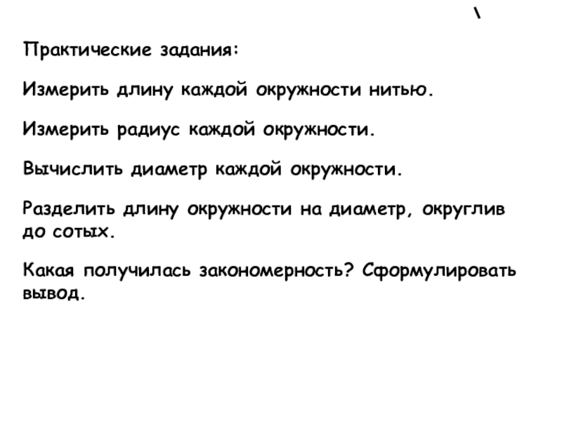 Практические задания:Измерить длину каждой окружности нитью.Измерить радиус каждой окружности.Вычислить диаметр каждой окружности.Разделить длину окружности на диаметр, округлив