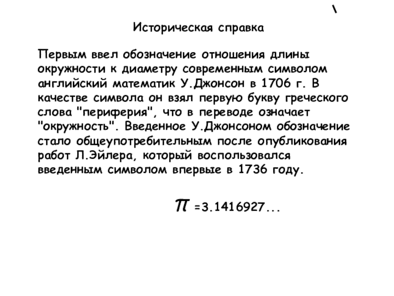 Историческая справка Первым ввел обозначение отношения длины окружности к диаметру современным символом английский математик У.Джонсон в 1706
