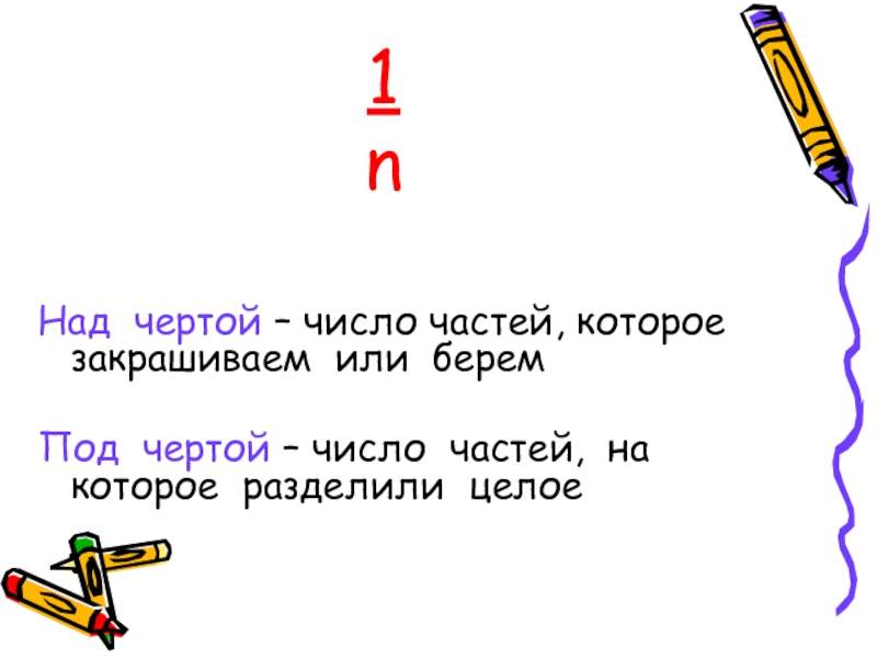 1nНад чертой – число частей, которое закрашиваем или беремПод чертой – число частей, на которое разделили целое