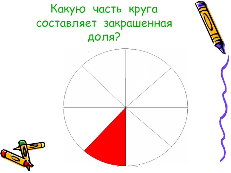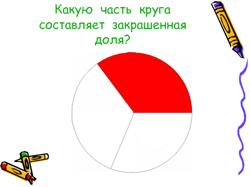 Слайд 13Какую часть круга составляет закрашенная доля?