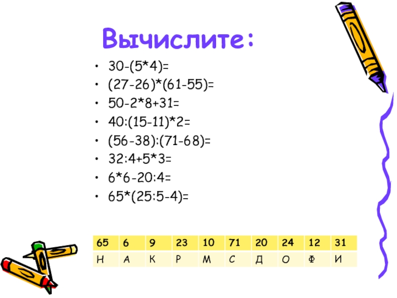 Вычислите:30-(5*4)=(27-26)*(61-55)=50-2*8+31=40:(15-11)*2=(56-38):(71-68)=32:4+5*3=6*6-20:4=65*(25:5-4)=