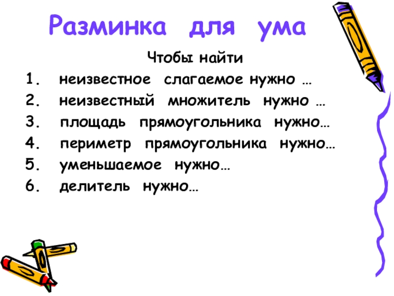 Разминка для умаЧтобы найтинеизвестное слагаемое нужно …неизвестный множитель нужно …площадь прямоугольника нужно…периметр прямоугольника нужно…уменьшаемое нужно…делитель нужно…