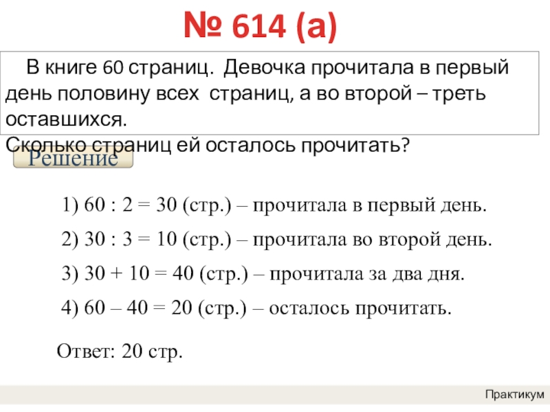 1) 60 : 2 = 30 (стр.) – прочитала в первый день.