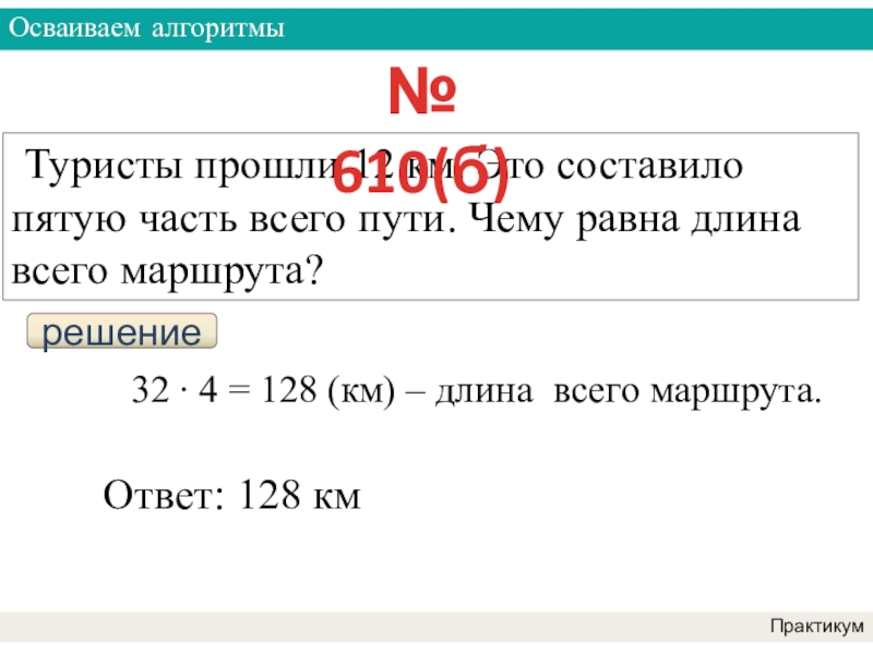 32 ∙ 4 = 128 (км) – длина всего маршрута.