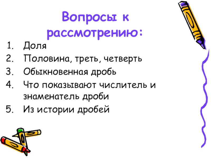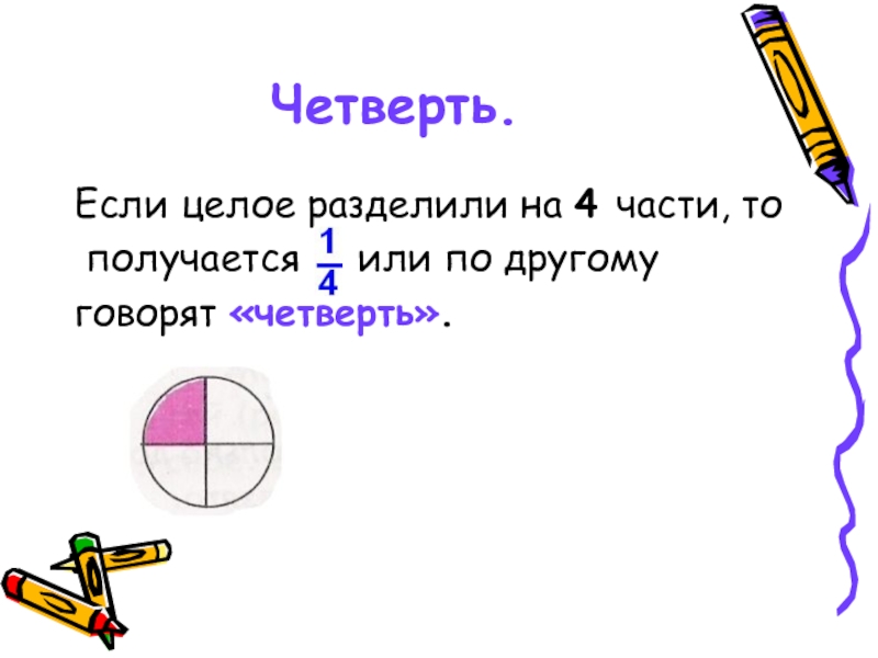 Познакомить с понятием доля, половина, треть, четверть, обыкновенная дробь,