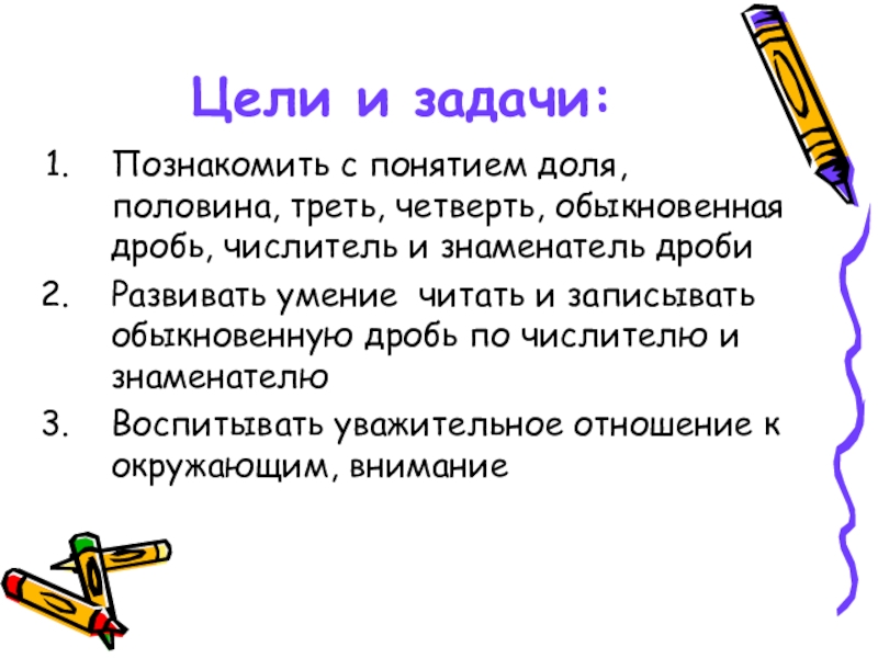Развивать умение читать и записывать обыкновенную дробь по числителю и знаменателю