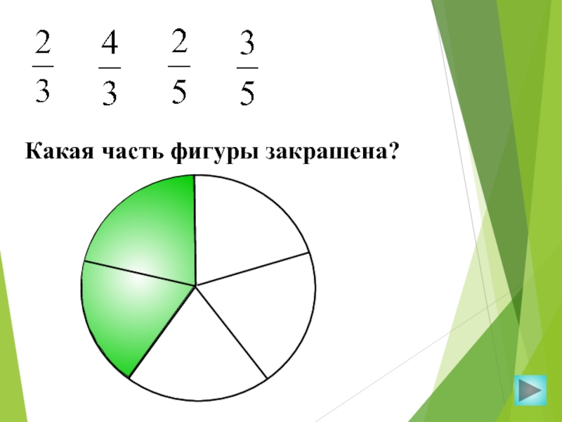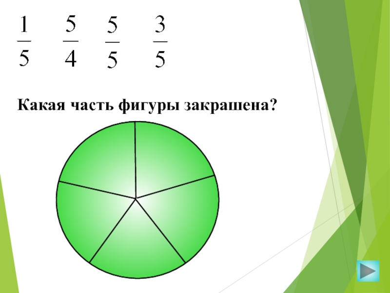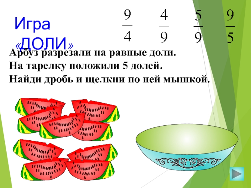 Игра «ДОЛИ»Арбуз разрезали на равные доли. На тарелку положили 5 долей. Найди дробь и щелкни по ней
