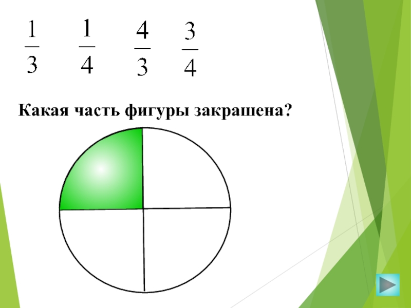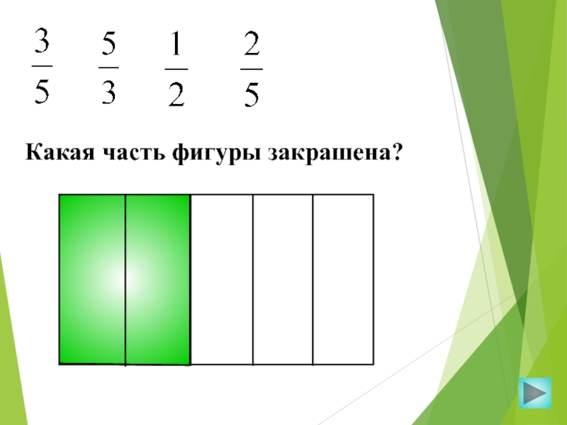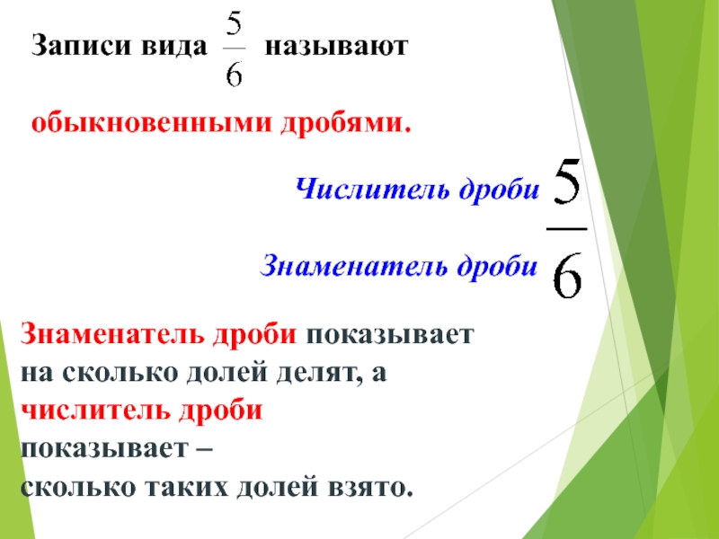 Знаменатель дроби показывает на сколько долей делят, а числитель дроби показывает – сколько таких долей взято.Записи вида