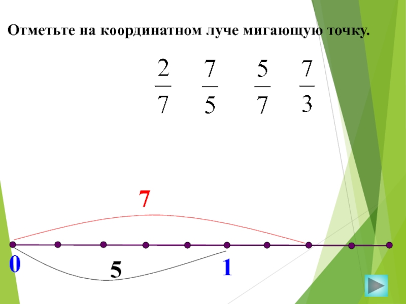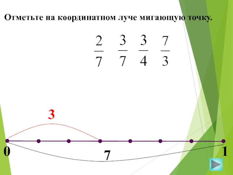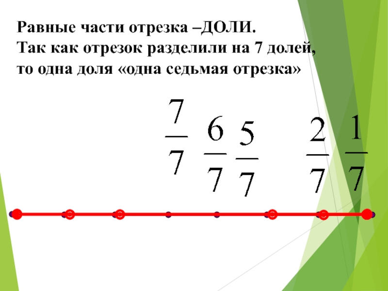 Равные части отрезка –ДОЛИ.Так как отрезок разделили на 7 долей, то одна доля «одна седьмая отрезка»