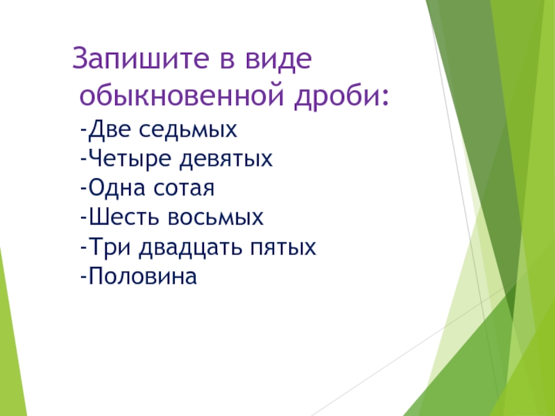 Слайд 29 Запишите в виде обыкновенной дроби: -Две седьмых -Четыре девятых -Одна сотая -Шесть