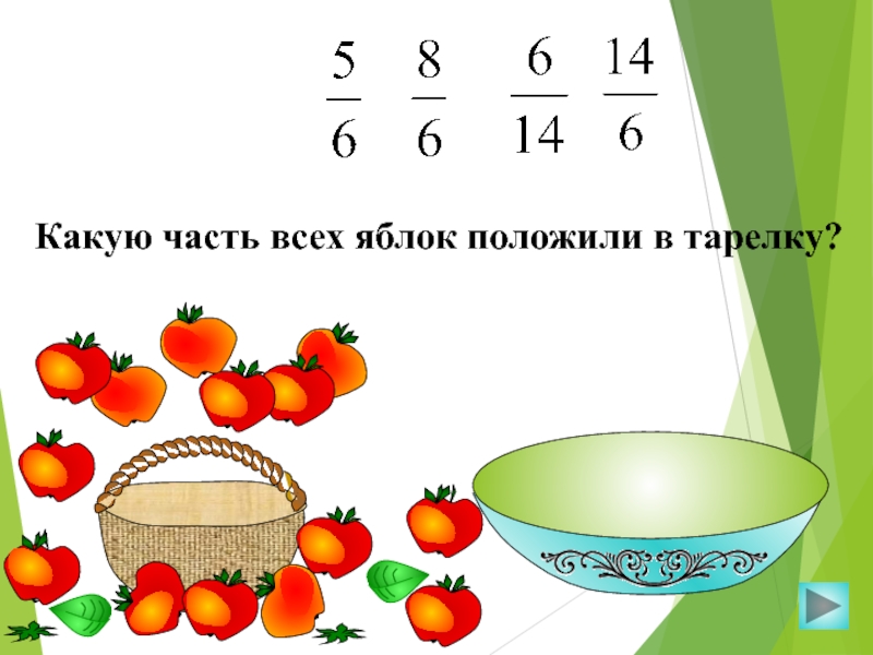 Слайд 20Какую часть всех яблок положили в тарелку?