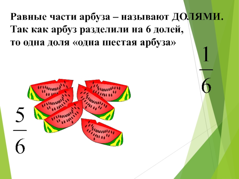 Слайд 2Равные части арбуза – называют ДОЛЯМИ.