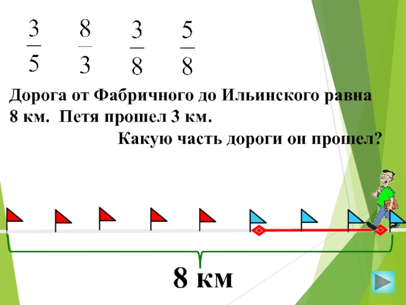 Дорога от Фабричного до Ильинского равна 8 км. Петя прошел 3 км.