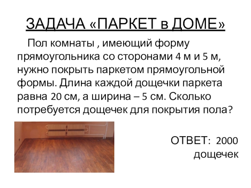 ЗАДАЧА «ПАРКЕТ в ДОМЕ» Пол комнаты , имеющий форму прямоугольника со сторонами 4 м и 5 м, нужно покрыть паркетом прямоугольной формы. Длина каждой дощечки паркета равна 20 см, а ширина – 5 см. Сколько