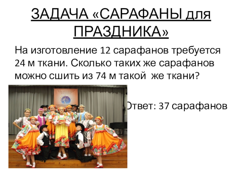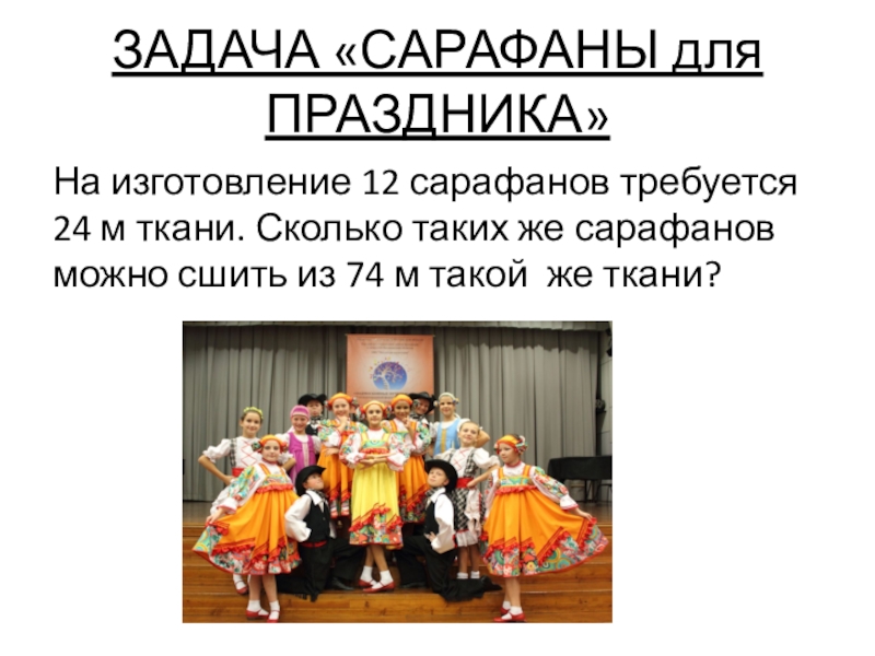 ЗАДАЧА «САРАФАНЫ для ПРАЗДНИКА»На изготовление 12 сарафанов требуется 24 м ткани. Сколько таких же сарафанов можно сшить