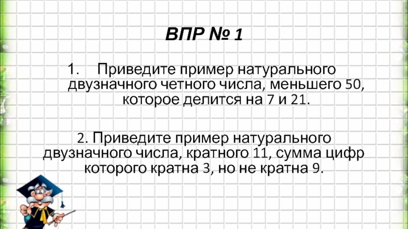 ВПР № 1Приведите пример натурального двузначного четного числа, меньшего 50, которое делится на 7 и 21.2. Приведите