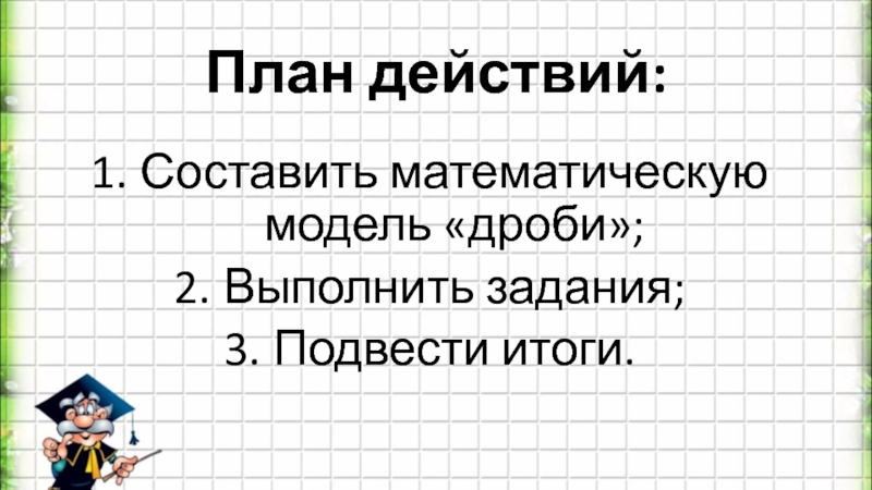 План действий: Составить математическую модель «дроби»;Выполнить задания; Подвести итоги.