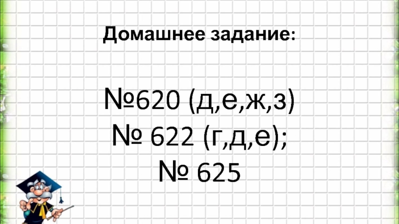 Домашнее задание: №620 (д,е,ж,з)№ 622 (г,д,е);№ 625