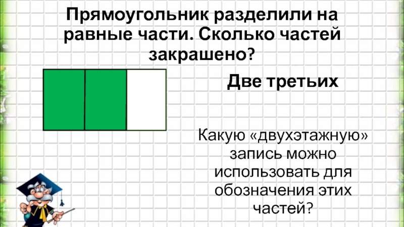 Прямоугольник разделили на равные части. Сколько частей закрашено? Две третьихКакую «двухэтажную» запись можно использовать для обозначения этих