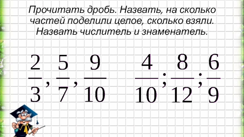 Слайд 9Прочитать дробь. Назвать, на сколько частей поделили целое, сколько взяли. Назвать