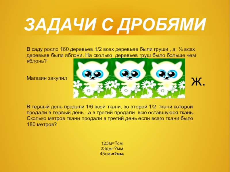 ½ часа =?мин 1/3 сут=?ч 1/8 сут=?ч 1/5 м=?см 1/10км=?м