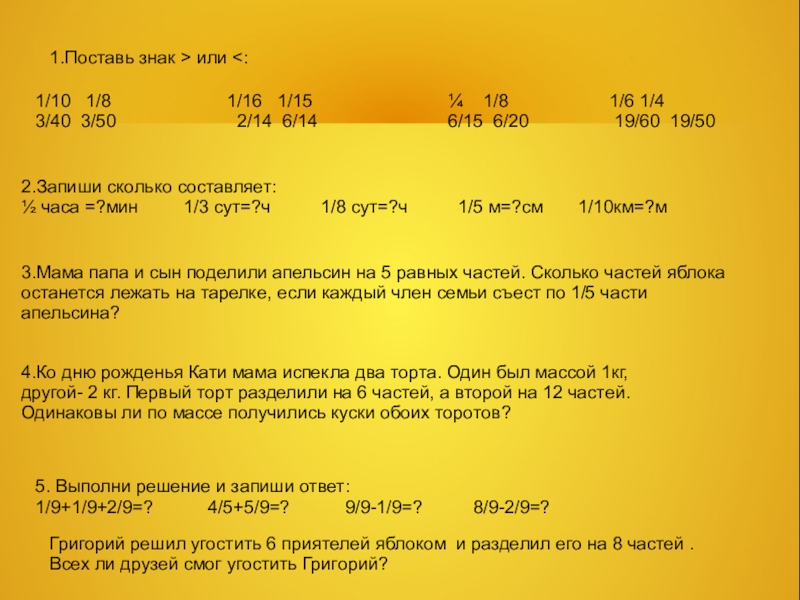 3.Мама папа и сын поделили апельсин на 5 равных частей. Сколько частей яблока останется лежать на тарелке, если каждый член семьи съест по 1/5 части апельсина?