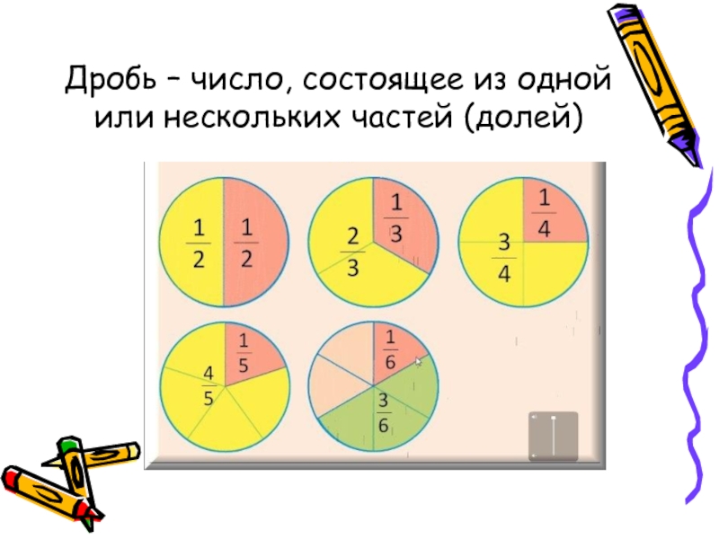 Слайд 3Дробь – число, состоящее из одной или нескольких частей (долей)