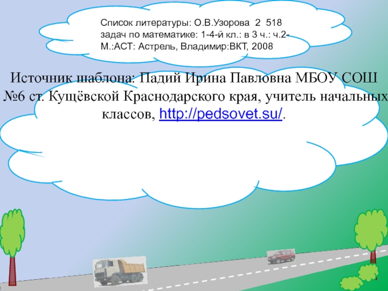 Список литературы: О.В.Узорова 2 518 задач по математике: 1-4-й кл.: в 3 ч.: ч.2-М.:АСТ: Астрель, Владимир:ВКТ, 2008