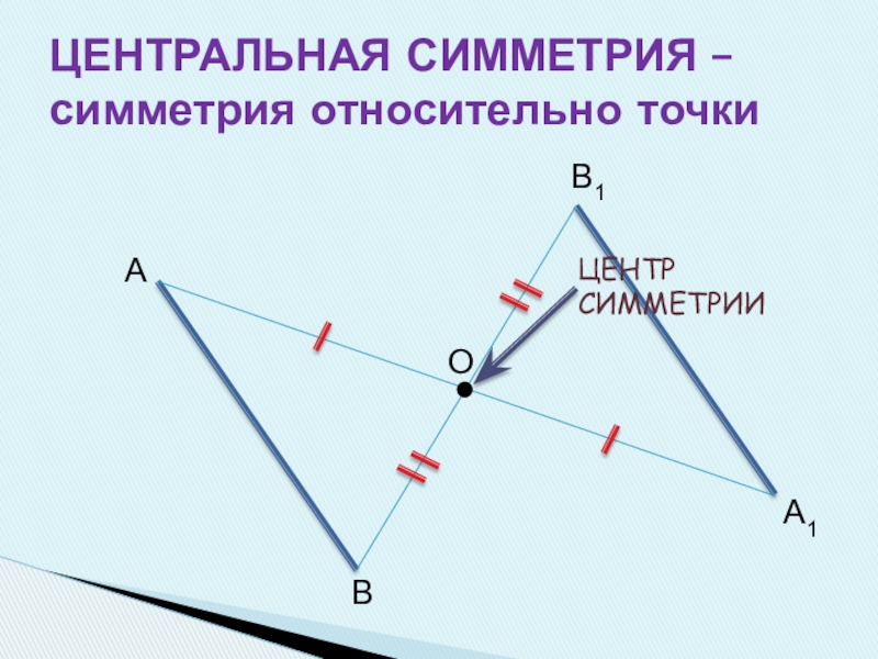 ЦЕНТРАЛЬНАЯ СИММЕТРИЯ – симметрия относительно точкиА1АВВ1О
