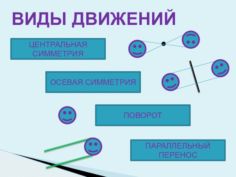 ВИДЫ ДВИЖЕНИЙОСЕВАЯ СИММЕТРИЯЦЕНТРАЛЬНАЯ СИММЕТРИЯПОВОРОТПАРАЛЛЕЛЬНЫЙ ПЕРЕНОС