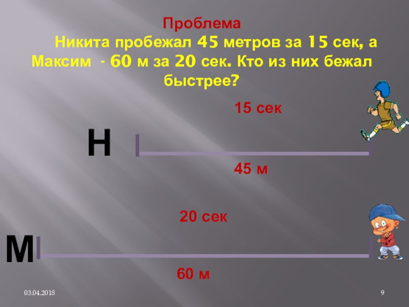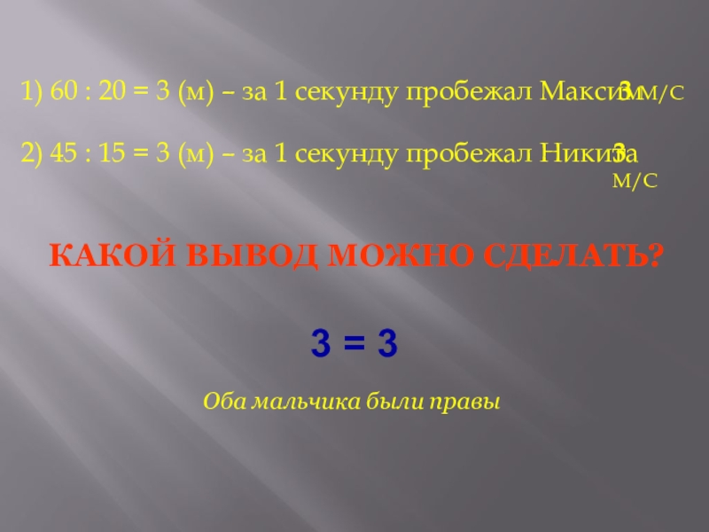2) 45 : 15 = 3 (м) – за 1 секунду пробежал Никита