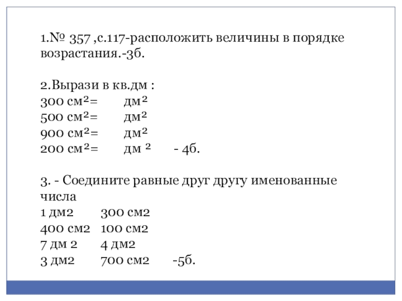 1.№ 357 ,с.117-расположить величины в порядке возрастания.-3б.2.Вырази в кв.дм :300 см²=    дм²500 см²=