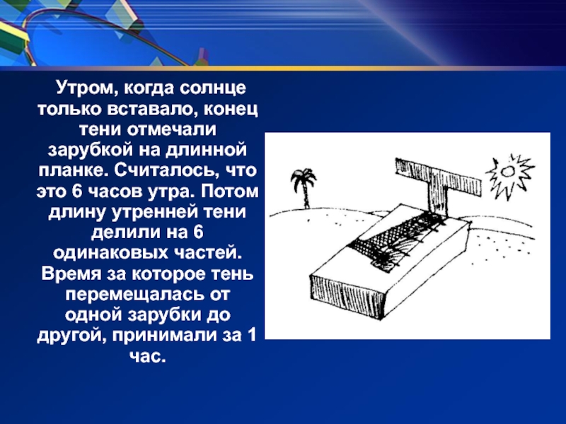 Слайд 13 Утром, когда солнце только вставало, конец тени отмечали зарубкой на длинной