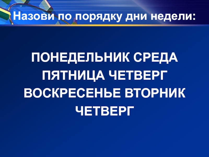 Назови по порядку дни недели:ПОНЕДЕЛЬНИК СРЕДА ПЯТНИЦА ЧЕТВЕРГ ВОСКРЕСЕНЬЕ ВТОРНИК ЧЕТВЕРГ