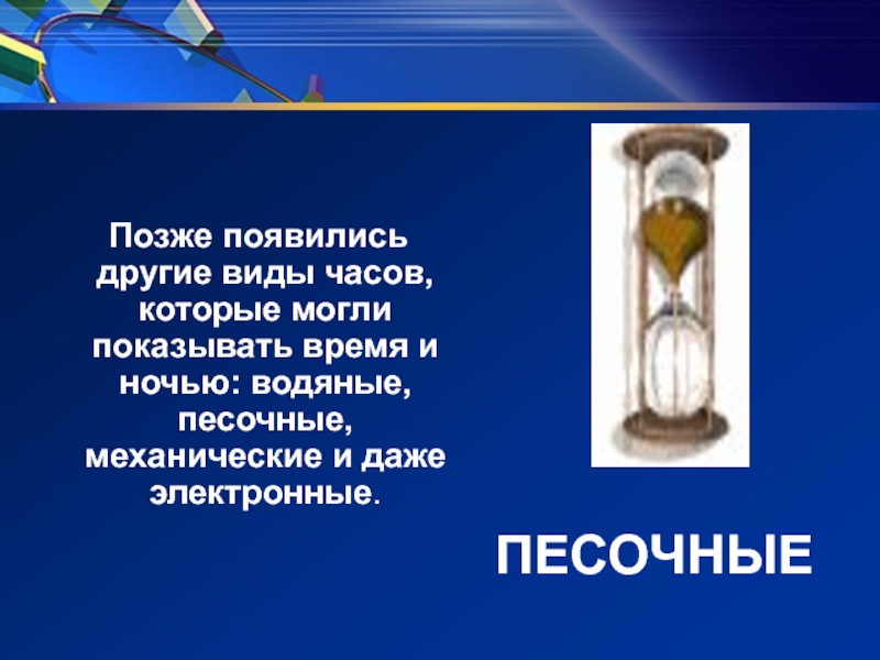 ПЕСОЧНЫЕ Позже появились другие виды часов, которые могли показывать время и ночью: водяные, песочные, механические и даже