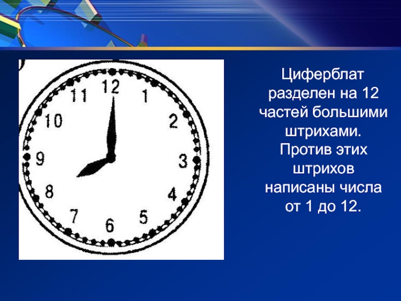Слайд 18 Циферблат разделен на 12 частей большими штрихами. Против этих