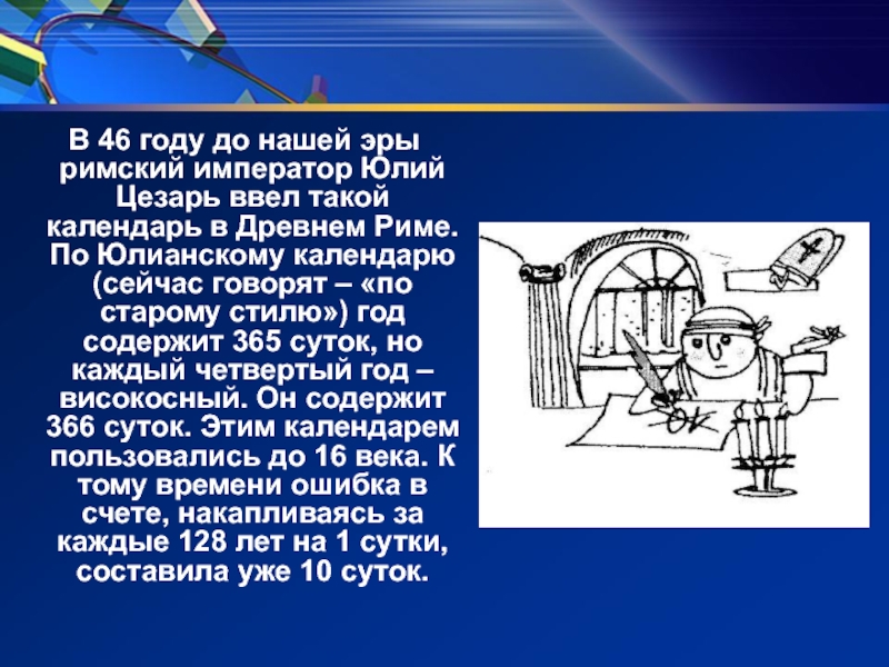 Слайд 4 В 46 году до нашей эры римский император Юлий Цезарь