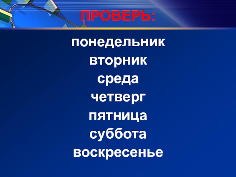 ПРОВЕРЬ:понедельниквторник средачетверг пятницасубботавоскресенье