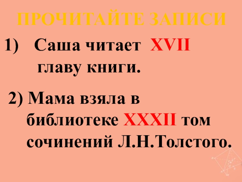 Прочитайте записиСаша читает XVII    главу книги.2) Мама взяла в   библиотеке XXXII том