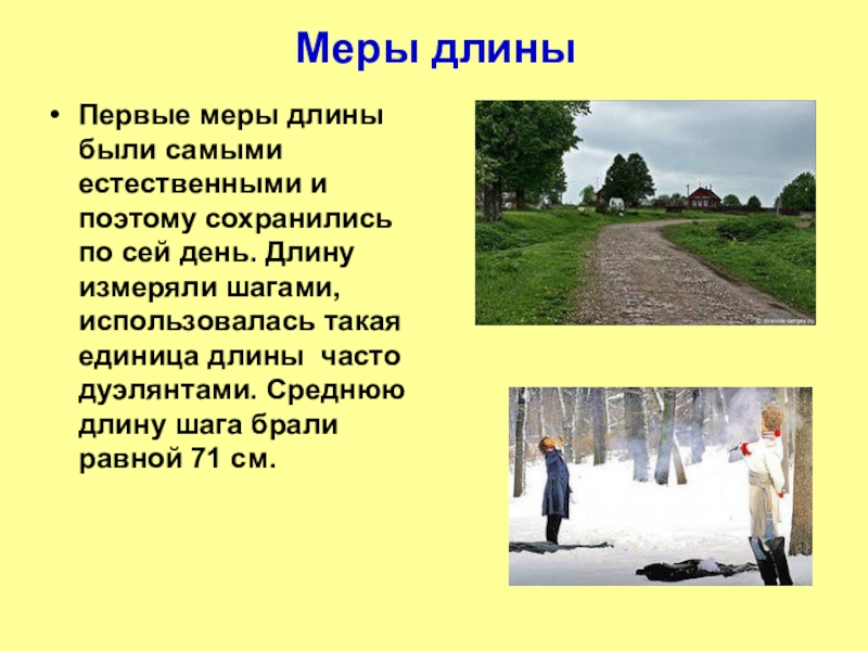 сей день. Длину измеряли шагами, использовалась такая единица длины часто дуэлянтами. Среднюю длину шага брали равной 71 см.
