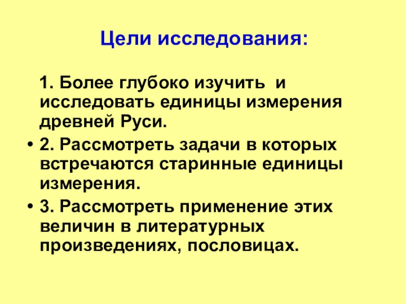 Знакомясь со старинными единицами измерений древней Руси, я понял, что необходимо помнить и знать старинные меры, ведь для расширения кругозора мы должны знать о прошлом жизни, быта и культуры нашего народа.