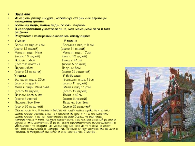 Оказалось, что у мамы и бабушки получились приблизительно одинаковые результаты, так как они по росту и телосложению одинаковые, у папы получились самые большие единицы измерения, а у меня самые маленькие, так как мы с папой разного роста и телосложения. В результате проведенного исследования я убедился, что старинные меры разные, кроме того они не дают точного результата в измерении. Точную длину шнурка мы нашли с помощью метровой линейки и она составила 2 метра.