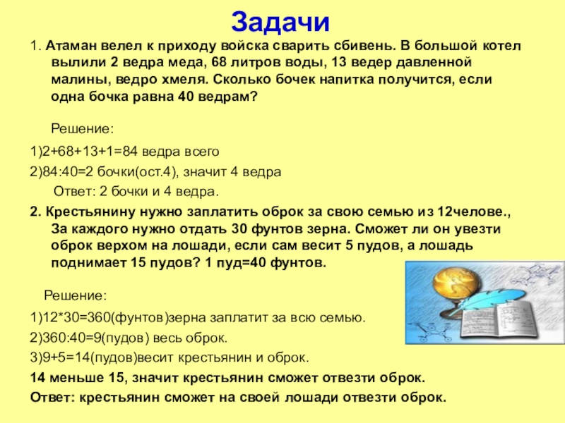 2. Рассмотреть задачи в которых встречаются старинные единицы измерения.